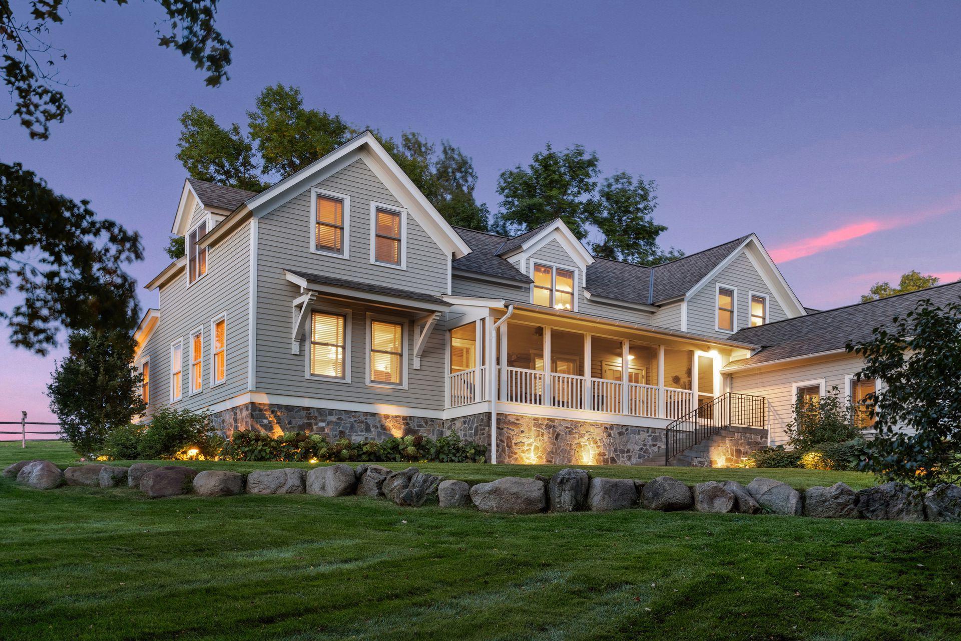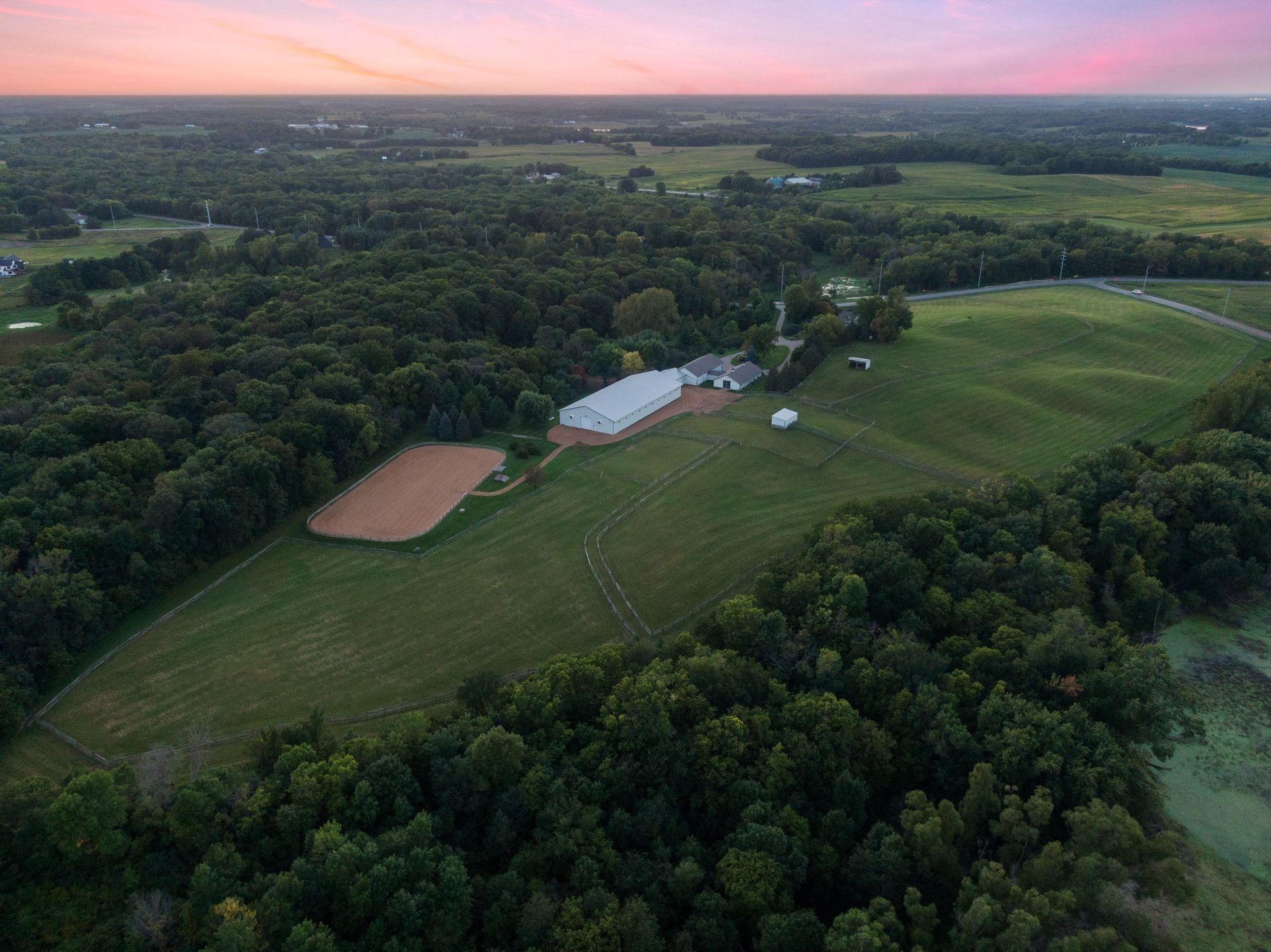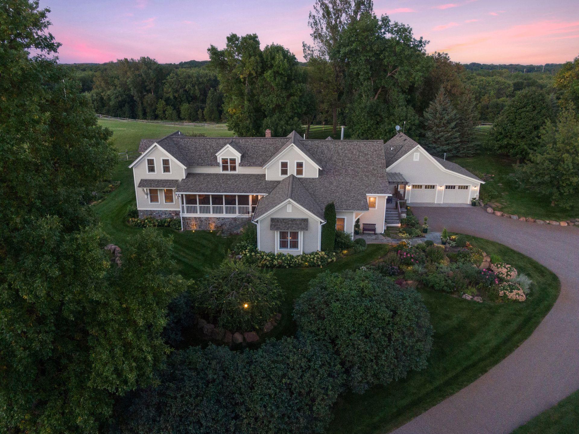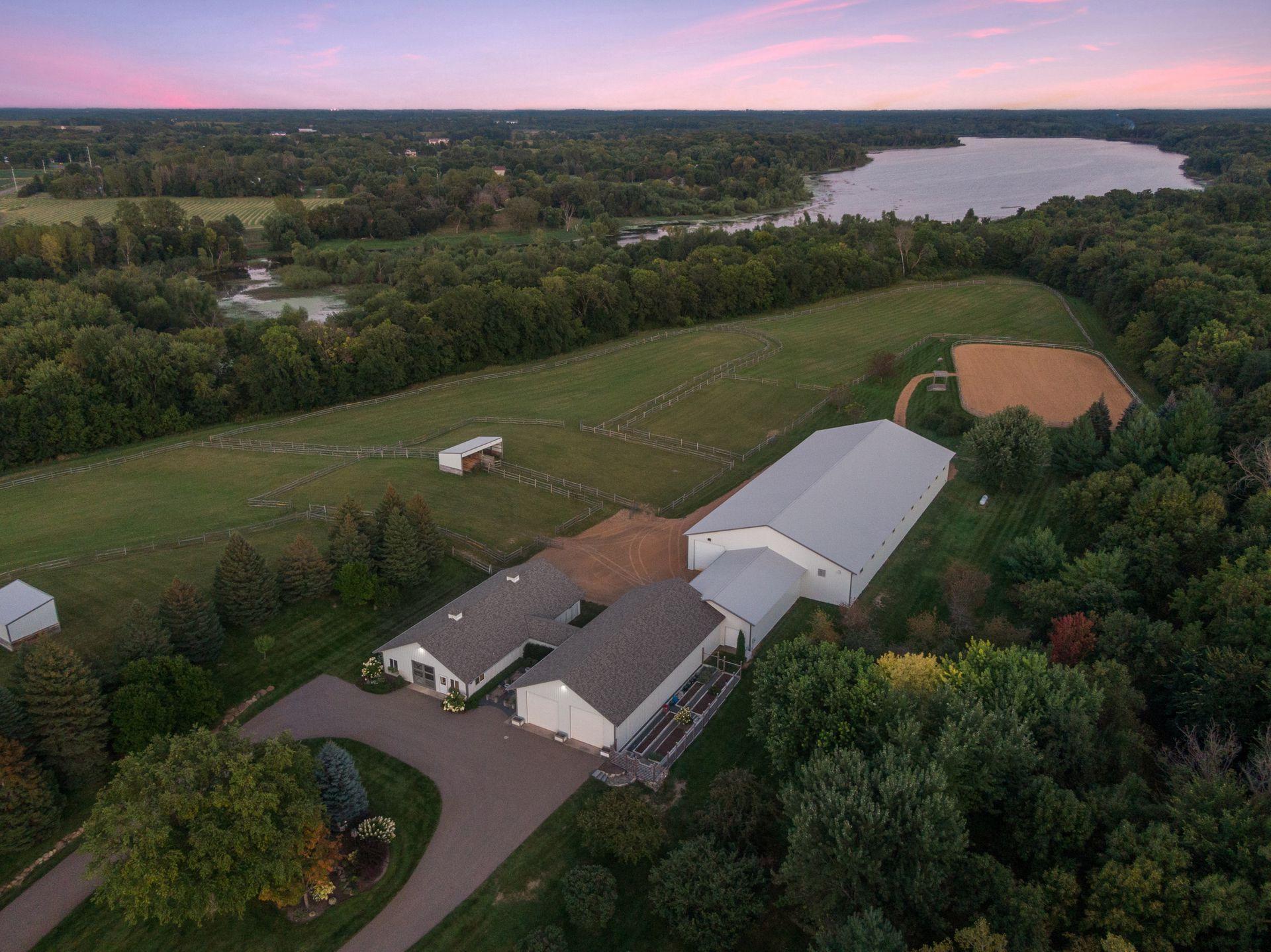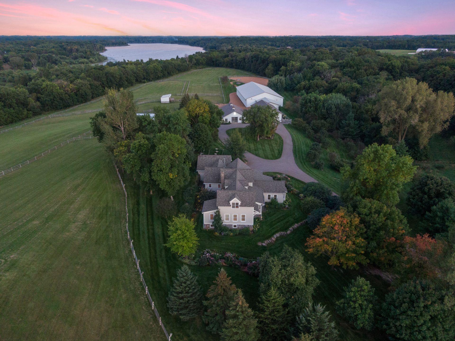 Welcome to this stunning European-inspired country estate, a unique opportunity to own one of the most premier equestrian properties in the area. Just minutes from Windsong Golf Club and perfectly nestled on 112 rolling acres of manicured pastures with split rail fencing, mature woods and trails, and Rice Lake shoreline. This magnificent luxury farmhouse was meticulously remodeled to replicate the timeless architecture of the great historical country estates; reclaimed pine floors grace the main level with accents of imported blue stone, exceptional custom millwork and attention to every detail combine to bring the perfect blend of formal and informal spaces that embrace warmth and charm. This is a timeless masterpiece. Not to be outdone, the exterior spaces will wow you with extensive perennial gardens, pollinator gardens, and raised vegetable gardens all with irrigation and beautiful landscape lighting. From every corner of this home, there are serene panoramic sunrise to sunset views - A true retreat for the soul. A short walk to the Equestrian barns will impress the most serious horse lover and competitor. An 8-stall barn with 12x12 stalls that include 2 grooming stalls, one wash stall, tack room, and end-to-end screened openings. Impressive indoor heated riding ring with surround sound, an outdoor riding ring with viewing gazebo, expansive machine shop and extra large hay facility as well as professional landscaping and full security system that includes barn and pasture cameras. This is a unique opportunity to own one of the premier Equestrian estates in the area. It is rare to find a stunning property with this acreage and exceptional location surrounded by pristine beauty and jaw dropping nature, and yet minutes to every amenity. A serious horse property and also a magical and stunning country home that feels like a European manor. This is a true legacy property