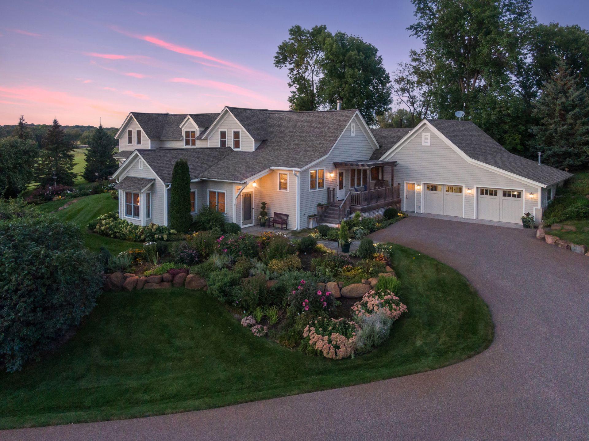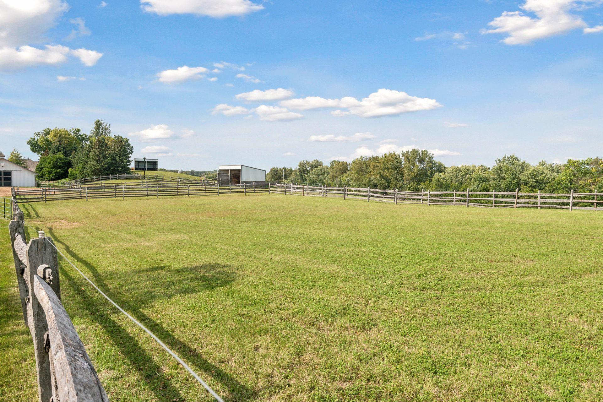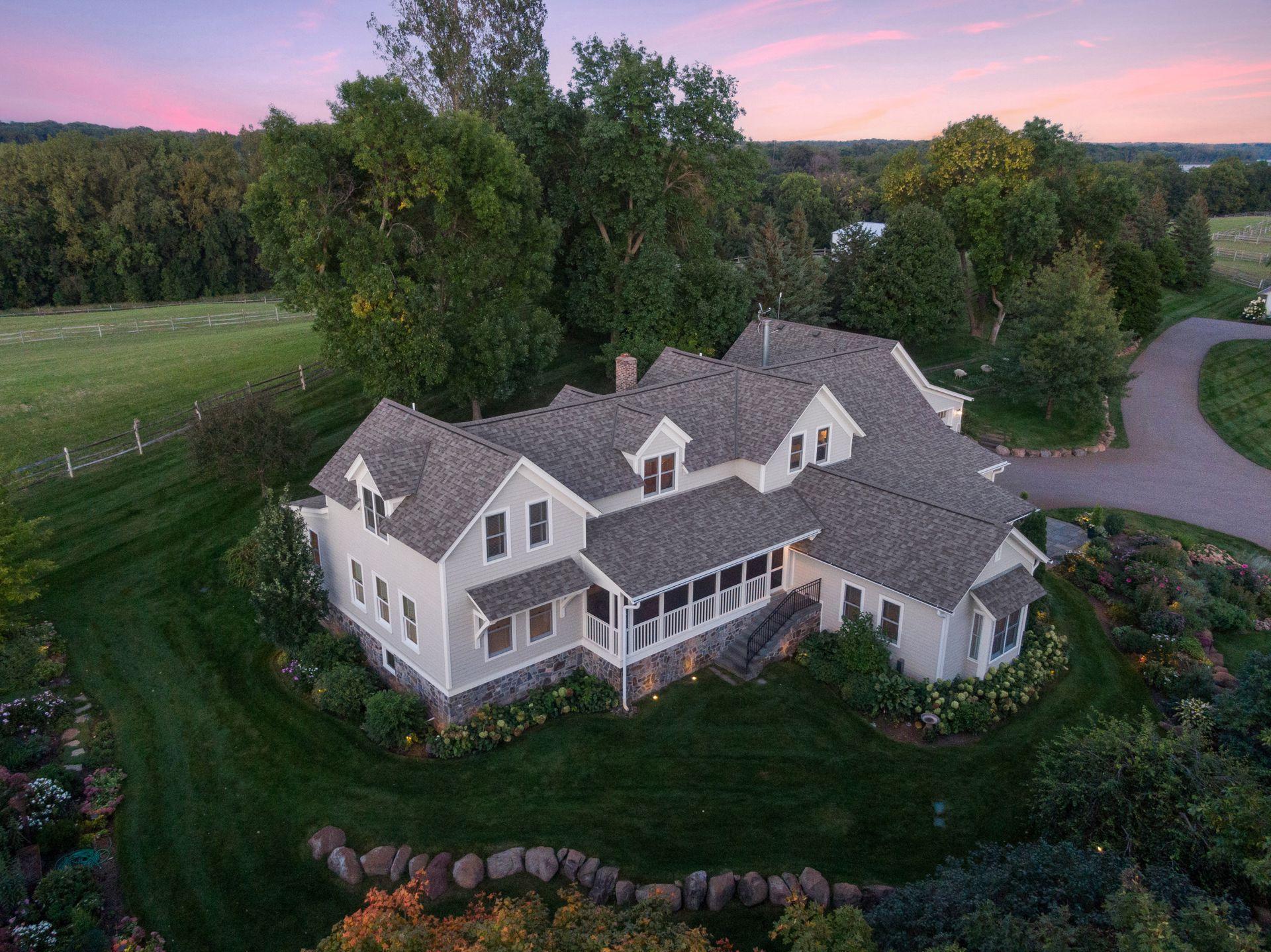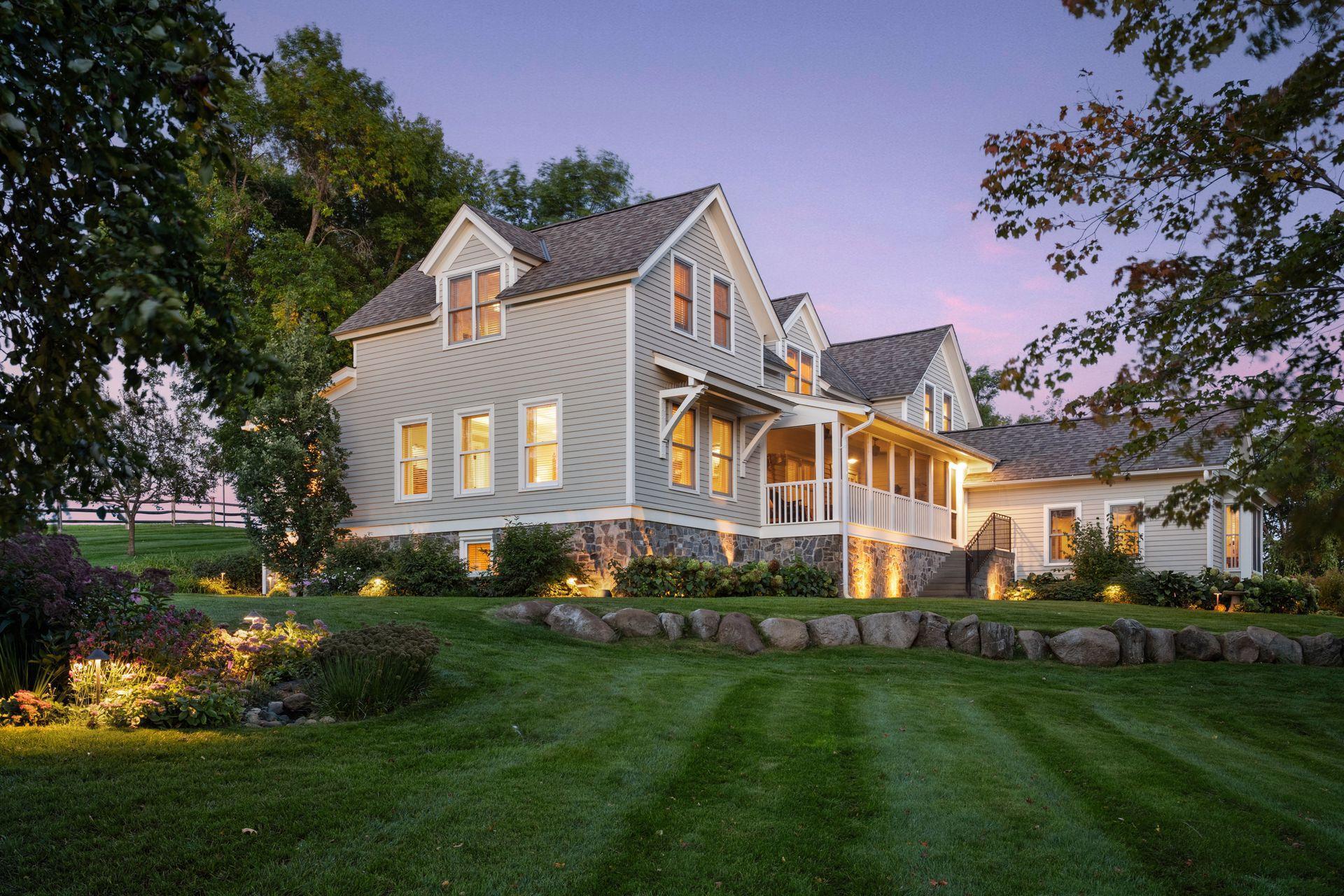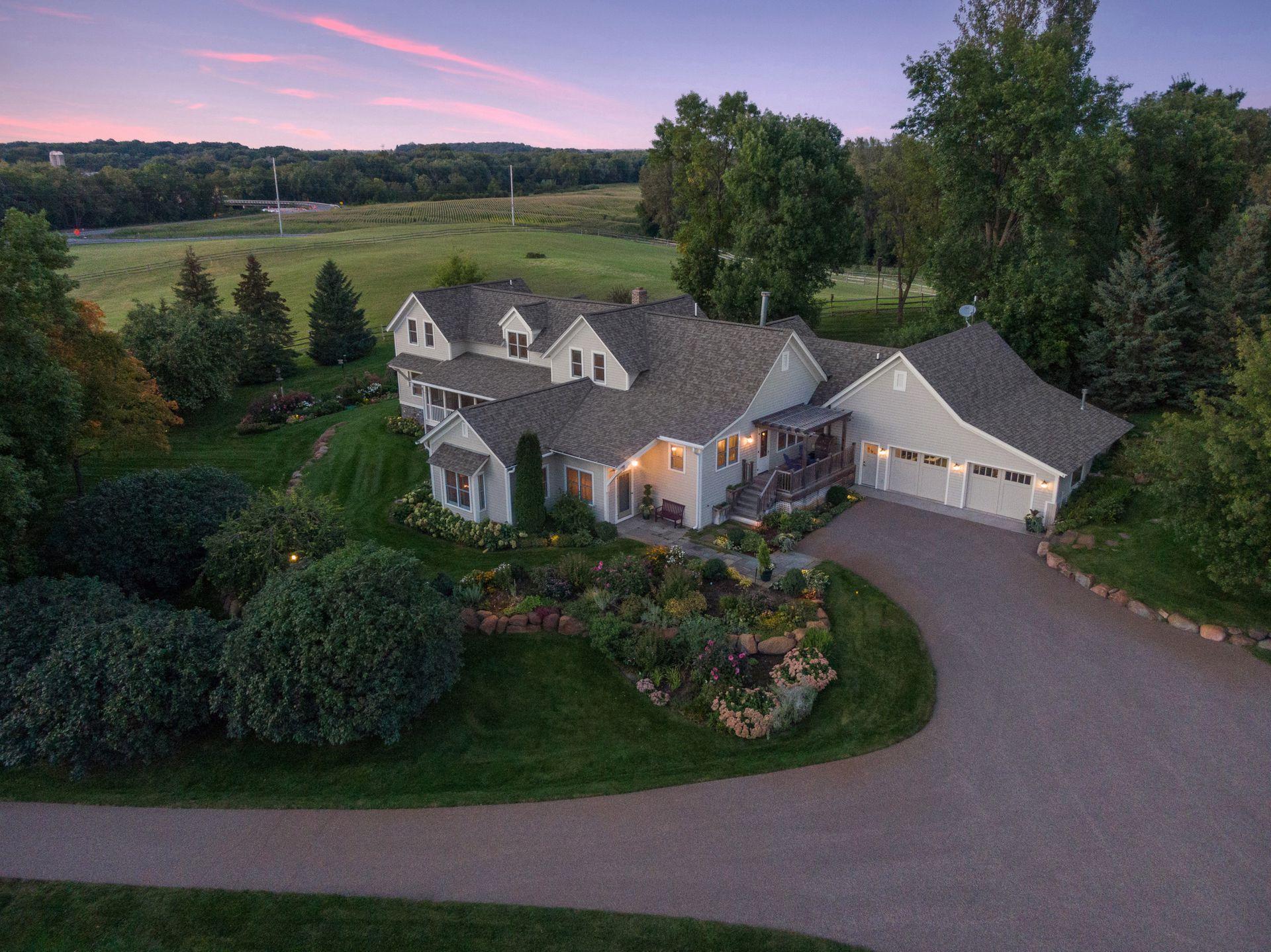 Welcome to this stunning European-inspired country estate, a unique opportunity to own one of the most premier equestrian properties in the area. Just minutes from Windsong Golf Club and perfectly nestled on 112 rolling acres of manicured pastures with split rail fencing, mature woods and trails, and Rice Lake shoreline. This magnificent luxury farmhouse was meticulously remodeled to replicate the timeless architecture of the great historical country estates; reclaimed pine floors grace the main level with accents of imported blue stone, exceptional custom millwork and attention to every detail combine to bring the perfect blend of formal and informal spaces that embrace warmth and charm. This is a timeless masterpiece. Not to be outdone, the exterior spaces will wow you with extensive perennial gardens, pollinator gardens, and raised vegetable gardens all with irrigation and beautiful landscape lighting. From every corner of this home, there are serene panoramic sunrise to sunset views - A true retreat for the soul. A short walk to the Equestrian barns will impress the most serious horse lover and competitor. An 8-stall barn with 12x12 stalls that include 2 grooming stalls, one wash stall, tack room, and end-to-end screened openings. Impressive indoor heated riding ring with surround sound, an outdoor riding ring with viewing gazebo, expansive machine shop and extra large hay facility as well as professional landscaping and full security system that includes barn and pasture cameras. This is a unique opportunity to own one of the premier Equestrian estates in the area. It is rare to find a stunning property with this acreage and exceptional location surrounded by pristine beauty and jaw dropping nature, and yet minutes to every amenity. A serious horse property and also a magical and stunning country home that feels like a European manor. This is a true legacy property