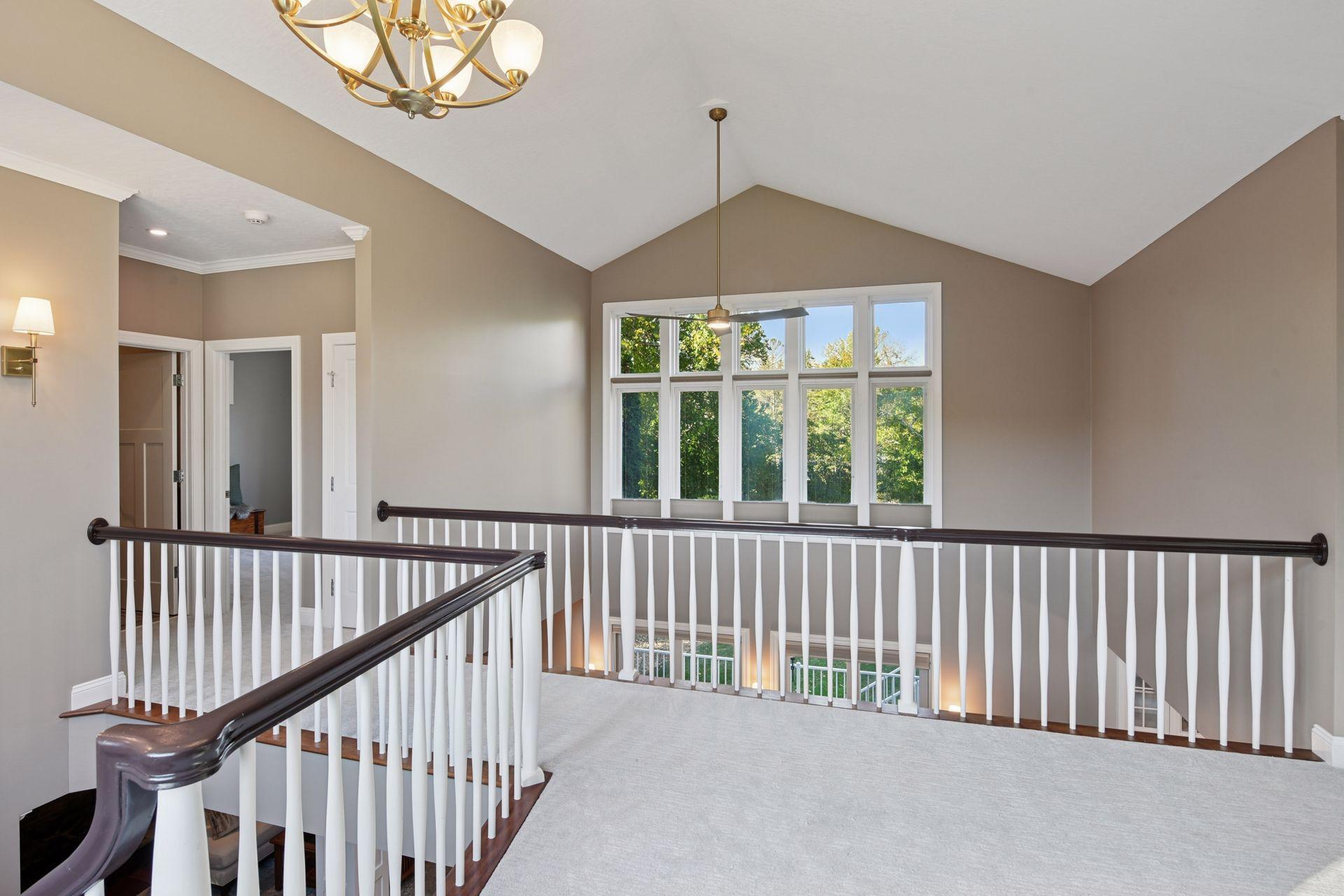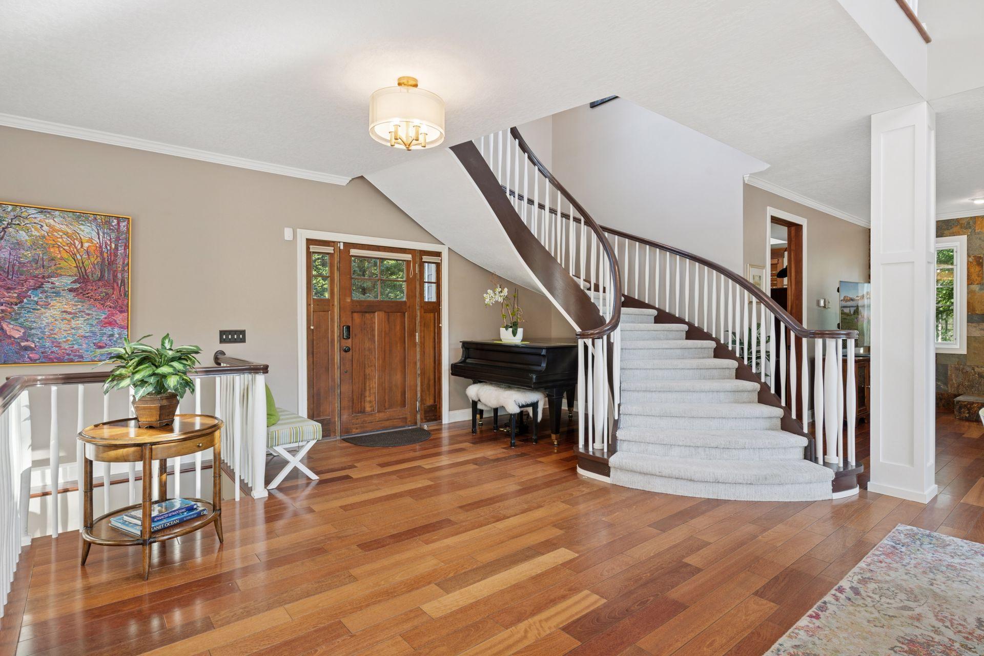 Step inside to a bright, airy interior featuring soaring ceilings, a cascading staircase, gleaming hardwood floors, and abundant natural light. A dedicated office on the main level provides the perfect space for remote work, study, or quiet focus--offering both functionality and style with large windows and custom built-ins that complement the home's modern aesthetic.